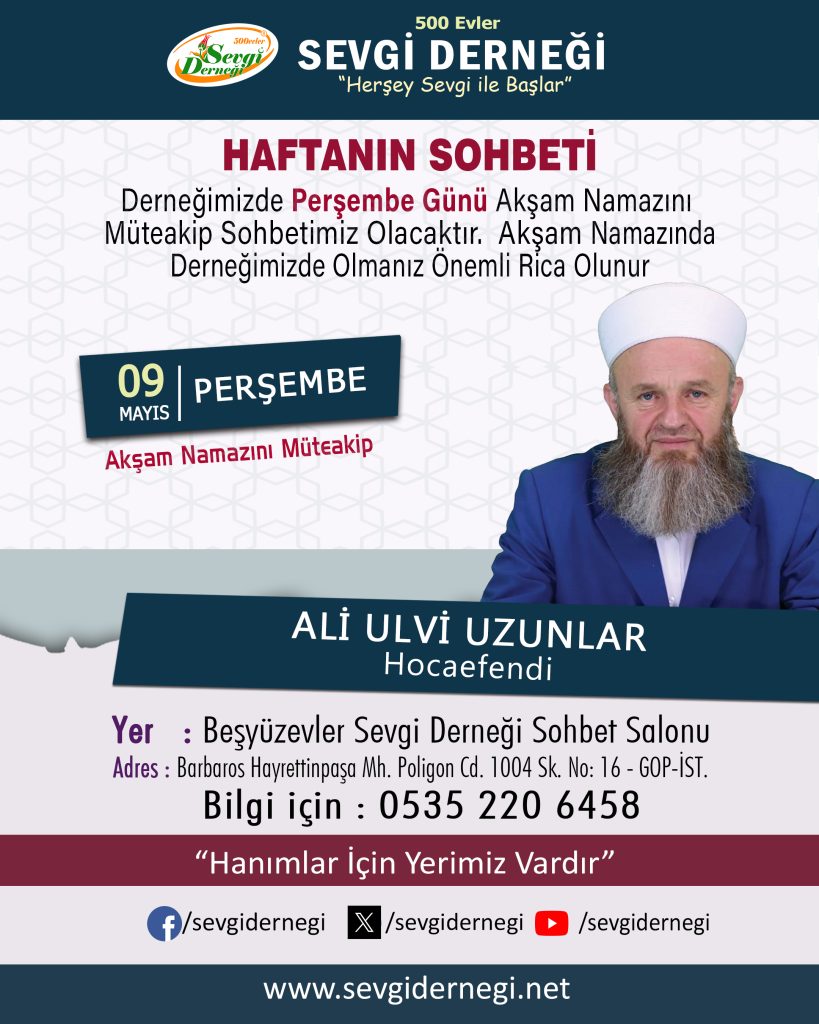 Ali Ulvi Uzunlar Hocaefendi, 9 Mayıs Perşembe Günü Akşam Namazından Sonra Haftanın Sohbeti Konuğumuz Olacaktır. Katılımlarınızı Bekliyoruz.